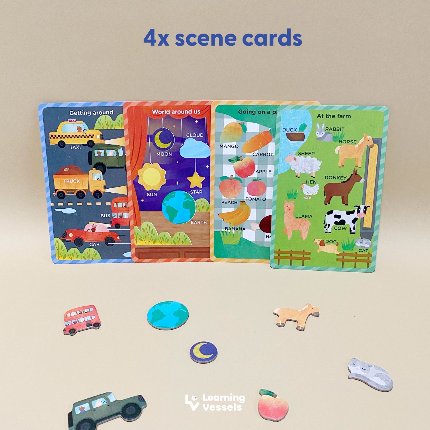 4x scene cards [Picnic, Farm, Transportation, World Around Us]