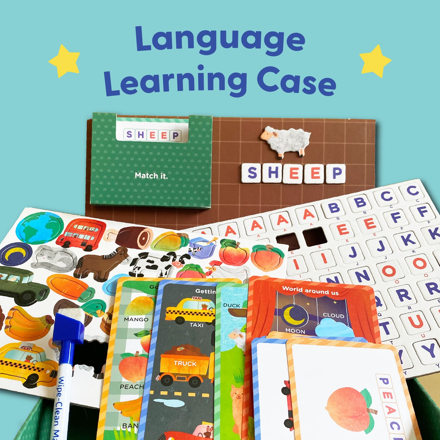 This hands-on language learning case targets the learning of the English alphabet as well as the reading and spelling of words. An accompanying guide provides instructions on how to introduce new words (vocabulary), match pictures to words as well as spelling/reading through progressively harder activities. The case also opens up to reveal a whiteboard writing surface for tracing of Aa to Zz in capital and lower case - a whiteboard marker is included. The cute, colourful illustrations and high quality magnetic pieces will provide a fun, interactive learning experience for children!
