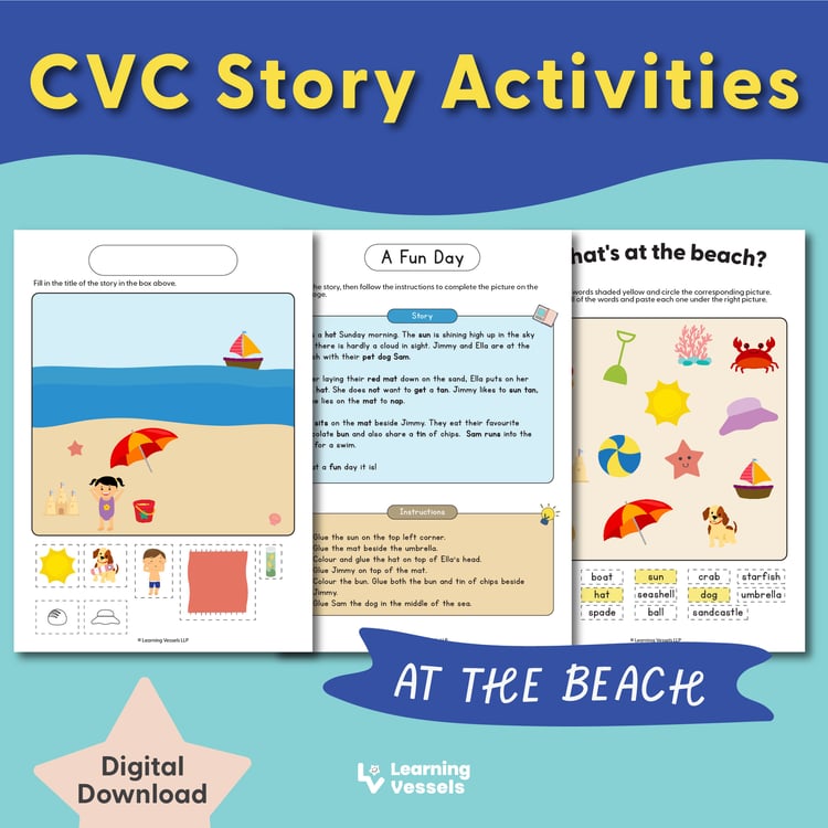 The CVC Sounds Sorting exercise will require the child to: - identify the starting and ending sound of words and move arrows to the letters that make these sounds - identify the correct middle vowel sounds of words and move the correct vowel into a middle box.