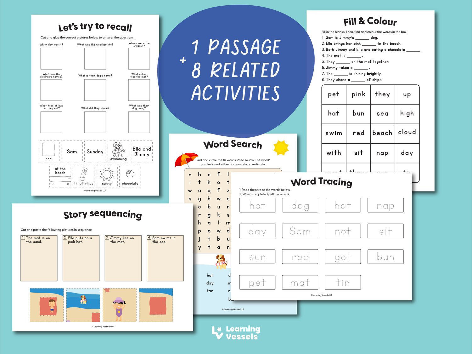 The PDF starts off with a passage-reading exercise, setting the stage for an interactive learning journey. From there, the activities focus on reinforcing CVC (Consonant-Vowel-Consonant) words found in the passage, enabling your child to practice blending these three-letter words through activities that train the child's fine motor, visual, and comprehension skills. The same words are incorporated throughout the story and activities, aiding word retention and recognition.