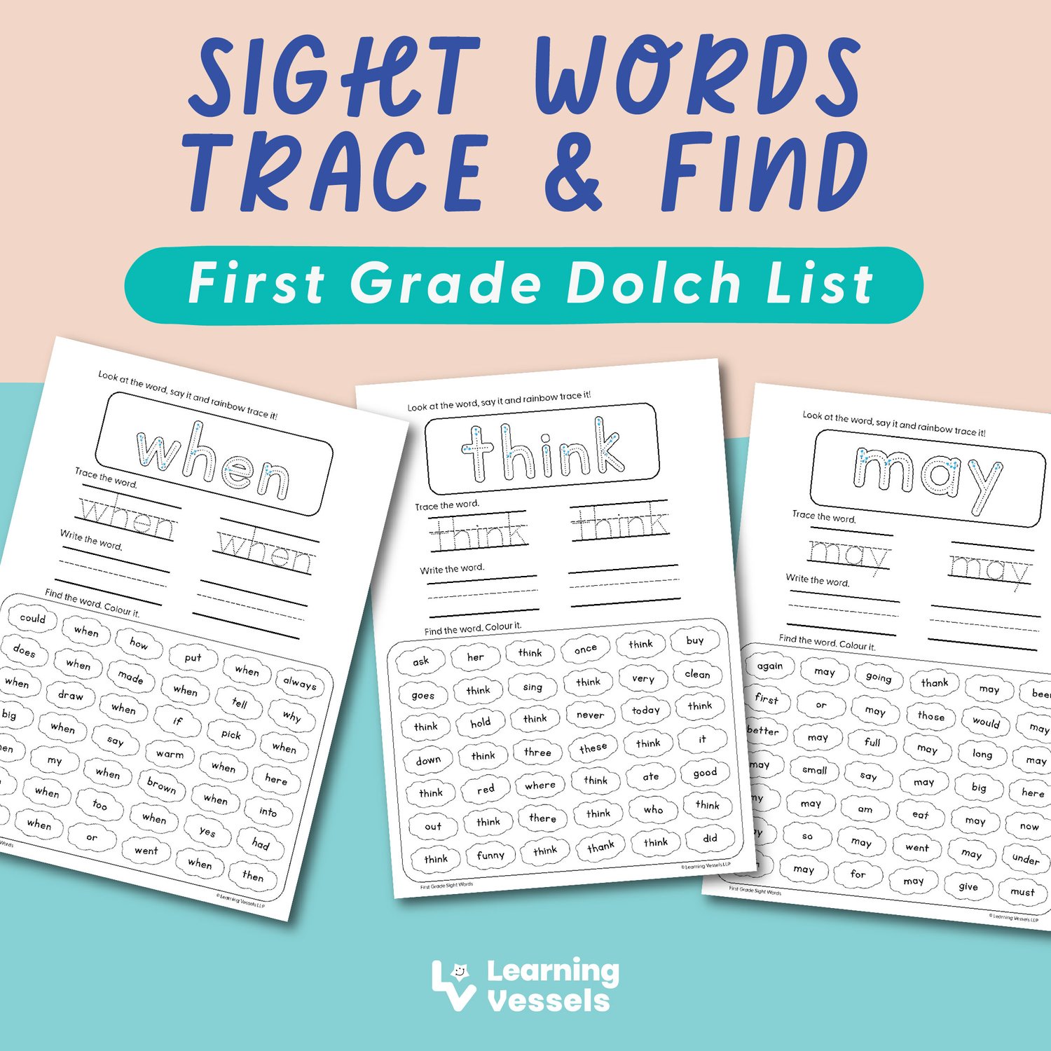 Each worksheet begins with an introductory rainbow tracing activity to introduce the word in a fun, visual way. Children then trace and write the word multiple times to reinforce spelling and recognition. Finally, a "find and color" exercise gets the child to spot the target word hidden among a mix of sight words from the Pre-Primer to Third Grade levels, helping to train visual discrimination skills.