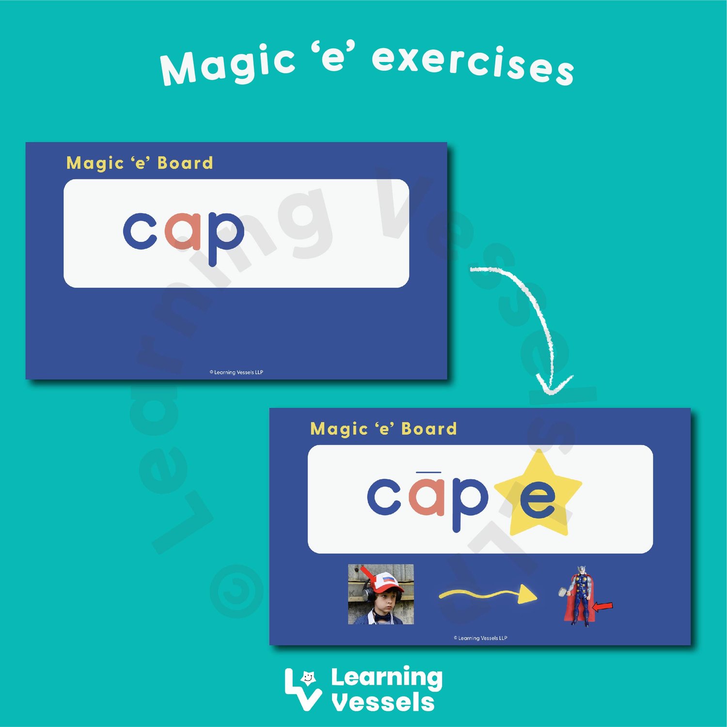 i. A set of slides for teaching the “Magic e” rule. The slides show how a CVC (Consonant-Sound-Consonant) word changes when a Magic ‘e’ is placed at the back of the word.