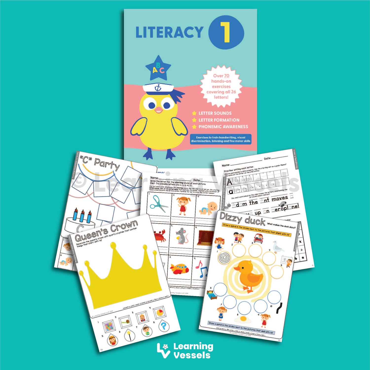 This colourful book contains over 70 hands-on exercises for sequencing the Aa to Zz, matching small letters to capital letters, correct formation of capital and small letters as well as visual discrimination of letters of different fonts (print awareness). We also included phonemic (sound) awareness exercises for the hard consonant and short vowel sounds of all 26 letters as well as craftwork to emphasize vowel sounds and for b-d discrimination.