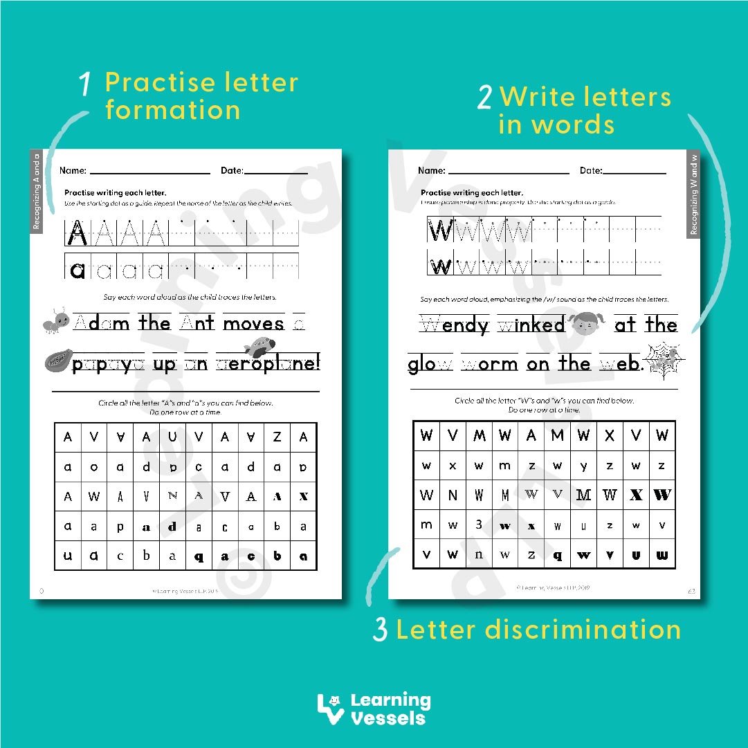 Meant for daily use for children from as young as 4 years old (with adult guidance). Includes a mix of cut-and-paste, tracing and writing activities to train fine-motor skills. Best used with "a" to "z" plastic or foam letters.